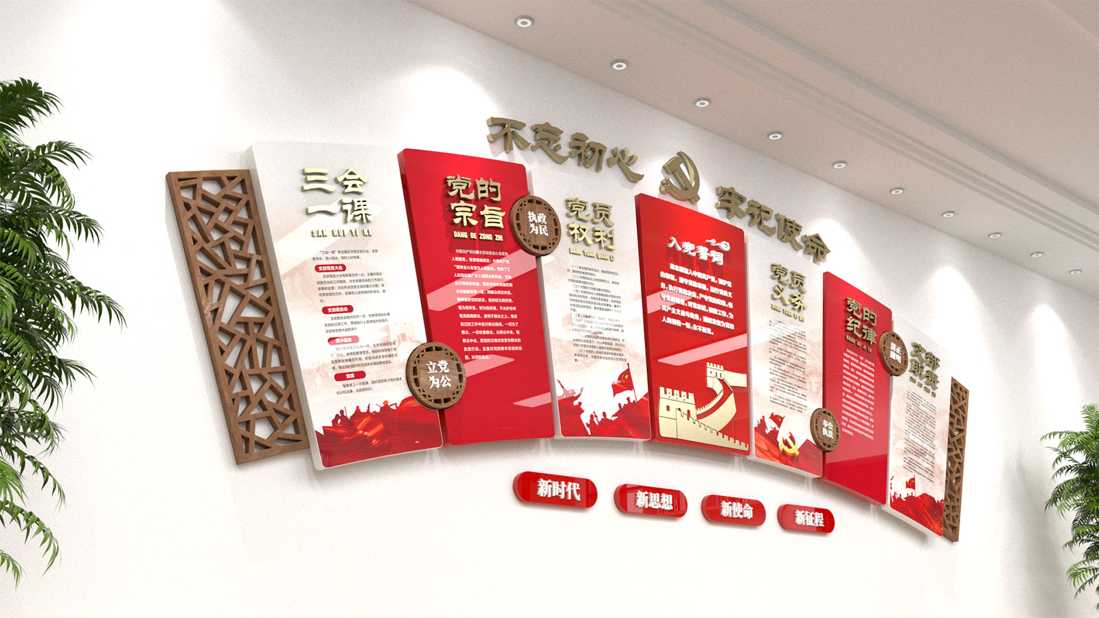黨建文化墻可將黨史、黨建、廉政、活動等板塊與黨建文化系列之應用場景進行巧妙設計之后,變成融合一體的系列文化宣傳工具。