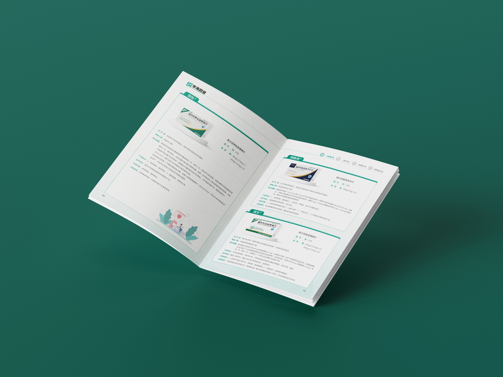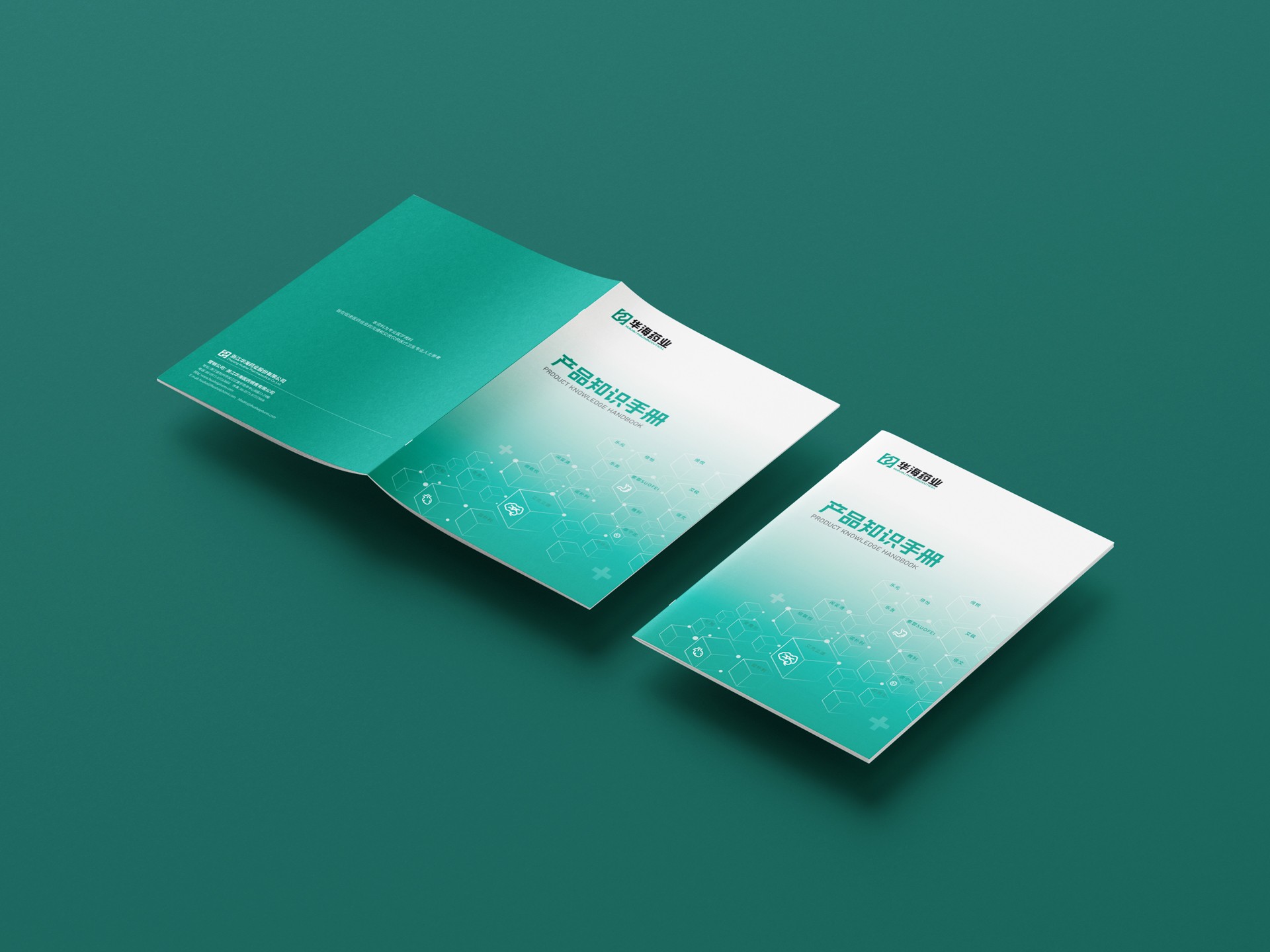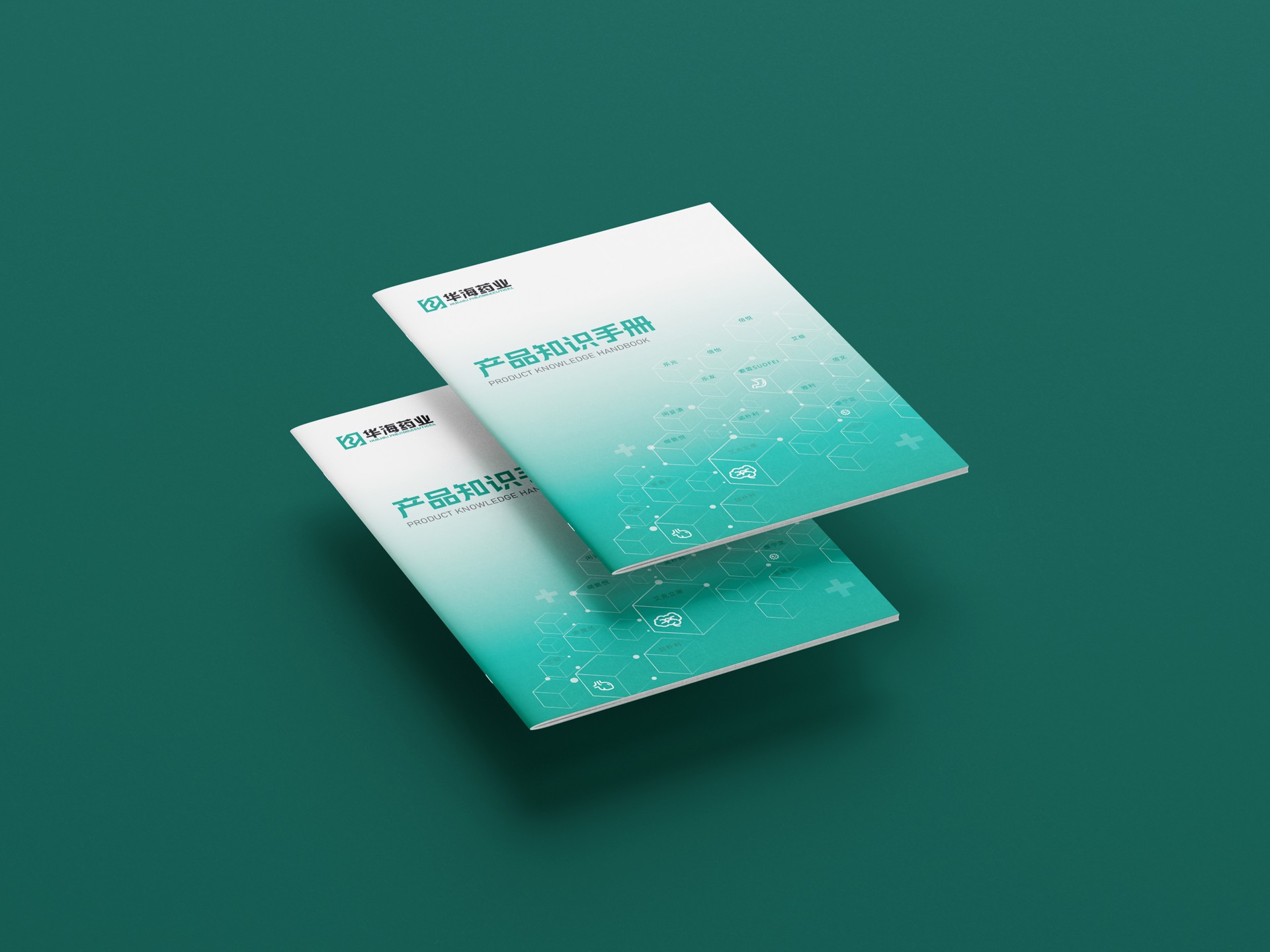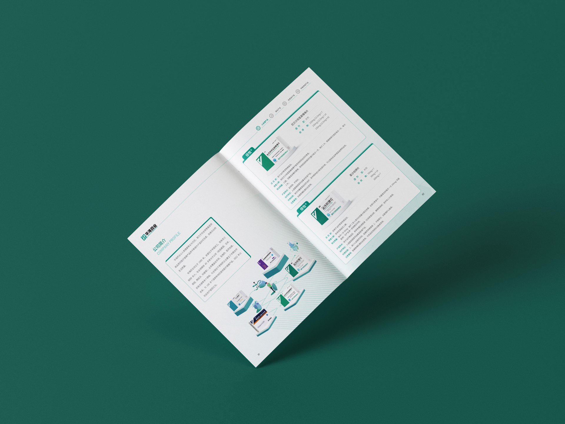 封面背景色采用綠色漸變,宣傳冊整體以華海藥業標志的標準色綠色為主,體現了企業“關愛生命”的宗旨,讓受眾可以看到華海藥業作為醫藥企業的生命力和成長性。