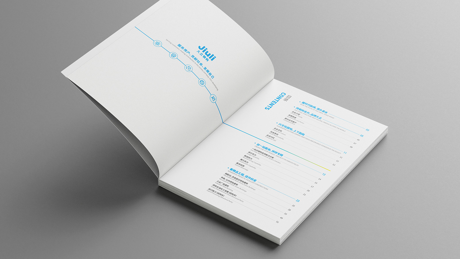 浙江久立鋼構工程有限公司創建于2001年2月,地處中國經濟最具活力之稱的“長三角”太湖南岸——浙江省湖州市,是久立集團的全資子公司,公司建有完善的質保體系,通過了ISO9001:2015質保體系的認證。擁有建設部頒發的鋼結構專業承包壹級資質。承接各類工業與民用鋼結構的設計、制造和安裝。公司立足國內市場,目前已在全國建立多個營銷辦事處,逐步形成了輻射全國的營銷網絡,并積極參與國際競爭?!耙猿墒斓募夹g和可靠的產品質量服務用戶,貢獻社會,發展自己”是久立的文化,可見公司對宣傳冊設計有著較高的要求,因此委托石特設計一本體現公司理念的宣傳冊。