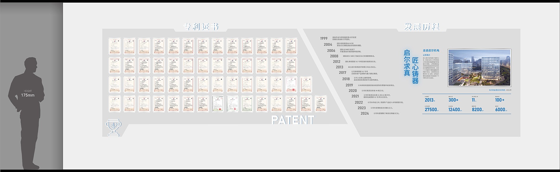2. 序廳(品牌形象區(qū))設(shè)計元素:采用高科技感的LED大屏播放公司宣傳片,結(jié)合動態(tài)光影效果,營造震撼的視覺效果。墻面設(shè)置企業(yè)形象墻,展示公司歷史沿革、榮譽獎項及核心團隊介紹。亮點:設(shè)置AR互動裝置,參觀者可通過手機或特定設(shè)備掃描二維碼,虛擬體驗公司發(fā)展歷程中的重要時刻。