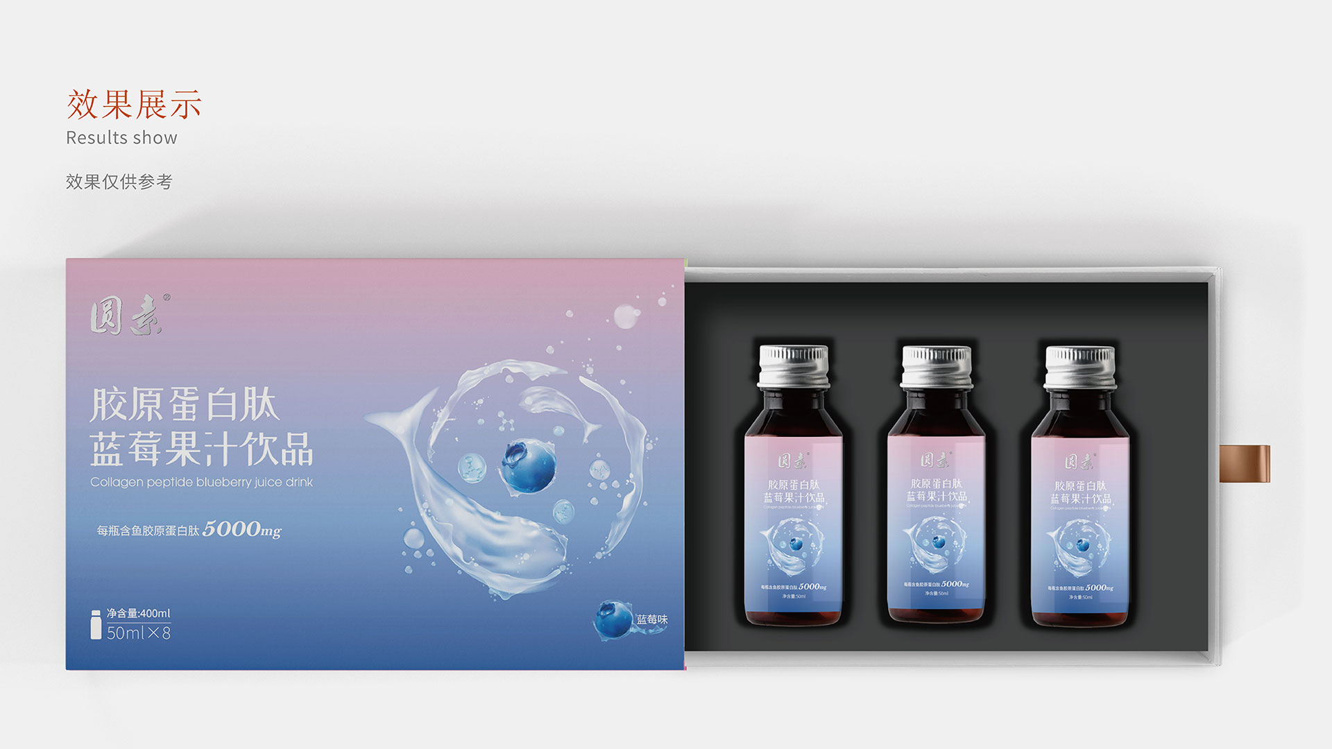 為能更好的突出藍莓濃縮果汁產品特性,根據品牌調性,石特在包裝上提出兩種方案:方案一:該款包裝以深海魚環繞藍莓游泳作為主畫面,其中深海魚以水狀的形態進行呈現,水滴融入分子式的元素,凸顯果汁飲品成分提取自深海魚的魚膠原蛋白;同時選取藍紫漸變色作為主色調,年輕且時尚,包裝整體干凈簡潔。